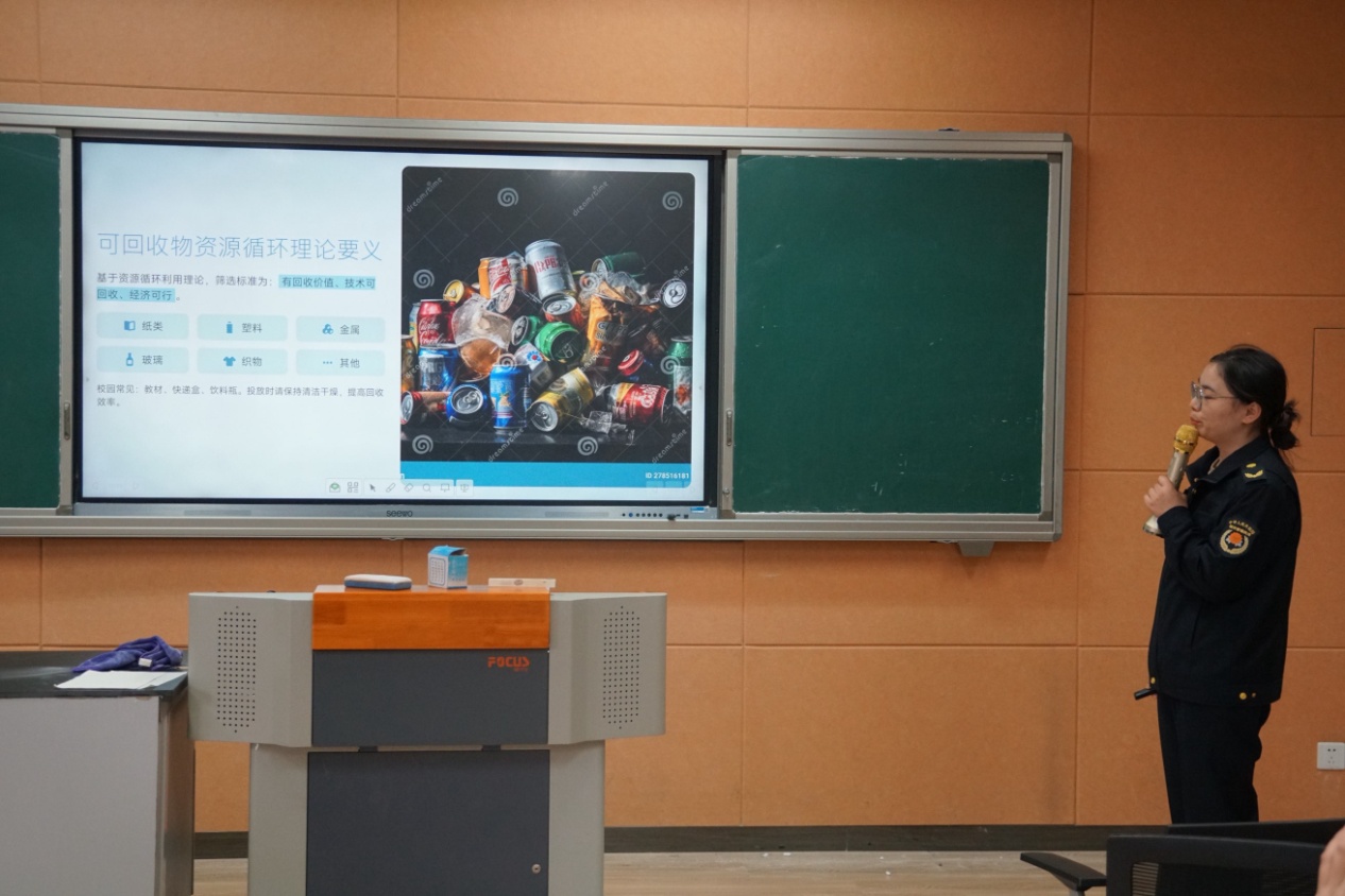 会上,潘青在讲解可回收物的资源循环理论、厨余垃圾的生物降解原理、实验室产生的废化学试剂、废液瓶等危险废物的专业管理要求等内容时,引发了化工专业同学们的浓厚兴趣与共鸣,加深了同学们对规范处理实验室垃圾的认识。宣讲会现场气氛热烈,同学们认真聆听,积极互动。2507班团支书吴欣梦表示,将从自身做起,从实验室和宿舍的垃圾分类做起,并积极运用新媒体技能,创作更多生动有趣的科普内容,带动身边同学共同投身垃圾分类的“新时尚”行动。