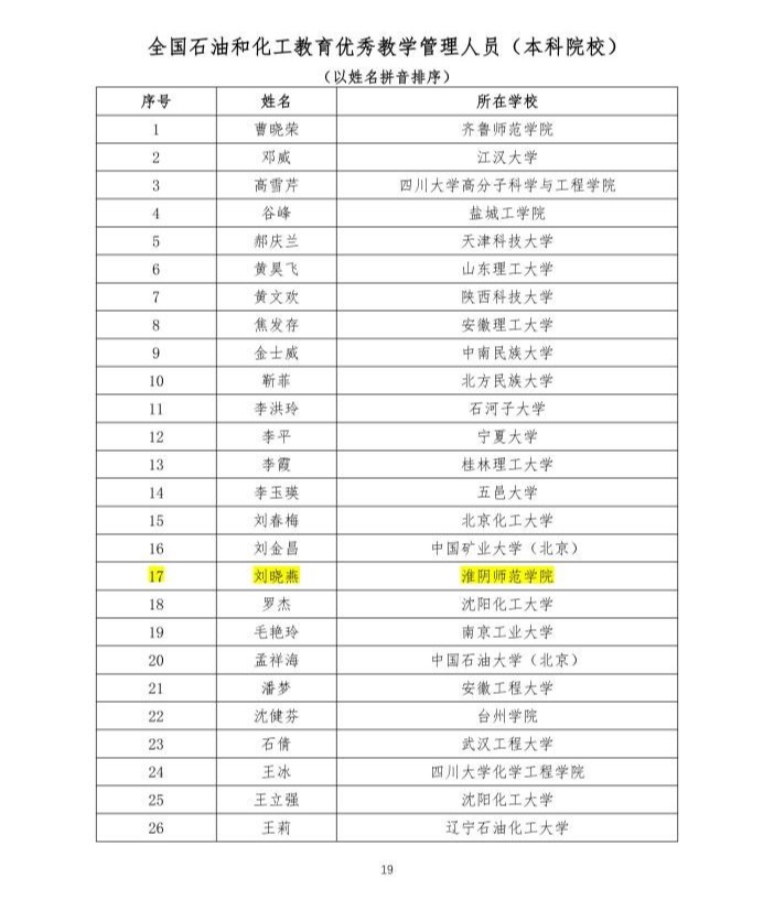 月份正式启动,经院校推荐、中国化工教育协会高校工作委员会初审、专家委员会评审等程序,最终评选出全国石油和化工教育优秀教学管理人员(本科院校)
