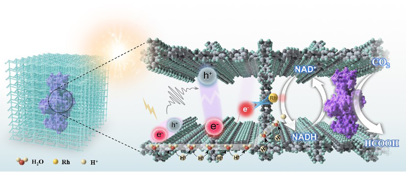 JACS作为国际化学及相关交叉领域最具影响力的学术期刊之一,对研究工作的原创性和科学价值要求极高。该工作充分依托学院多学科交叉优势,由许家兴教授与张续副教授协同开展。该成果围绕碳中和领域中二氧化碳绿色高效利用这一关键科学问题,创新构建光驱动生物催化体系,在水相条件下实现了可见光驱动CO₂向甲酸的高效转化。研究融合材料化学、光化学与生物催化等方向,构建了基于氢键有机框架(HOF)的光酶协同催化体系,实现了光生激子解离、电子-质子转移与酶催化过程的有机衔接,从机制层面揭示了能量传递与物质输运协同调控的内在规律,体现了学科交叉在解决复杂科学问题中的重要作用。